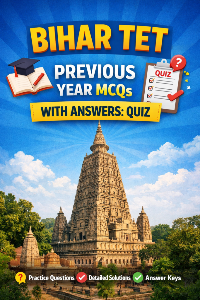 THE QUESTIONS PROVIDED IN “BIHAR TET PREVIOUS YEAR MCQS WITH ANSWERS: QUIZ” ARE MEMORY-BASED QUESTIONS COLLECTED FROM VARIOUS CANDIDATES AND PUBLICLY AVAILABLE SOURCES AFTER THE EXAMINATION. WHILE EVERY EFFORT HAS BEEN MADE TO ENSURE ACCURACY, THE CONTENT MAY NOT EXACTLY MATCH THE OFFICIAL BIHAR TET QUESTION PAPERS.