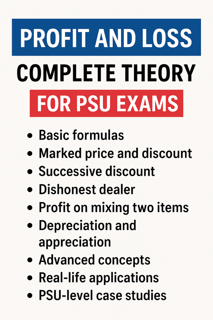 PROFIT AND LOSS IS AN ESSENTIAL CHAPTER IN QUANTITATIVE APTITUDE AND BUSINESS MATHEMATICS. IT FORMS THE BACKBONE OF COMMERCIAL ARITHMETIC AND IS HEAVILY TESTED IN PSU EXAMS, BANK EXAMS, SSC, RAILWAYS, INSURANCE EXAMS AND OTHER CENTRAL/STATE-LEVEL RECRUITMENT TESTS.